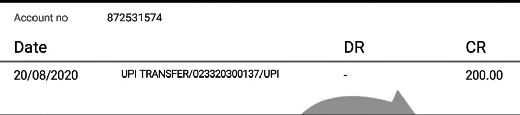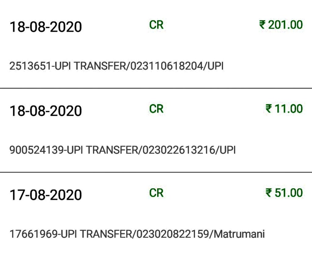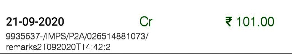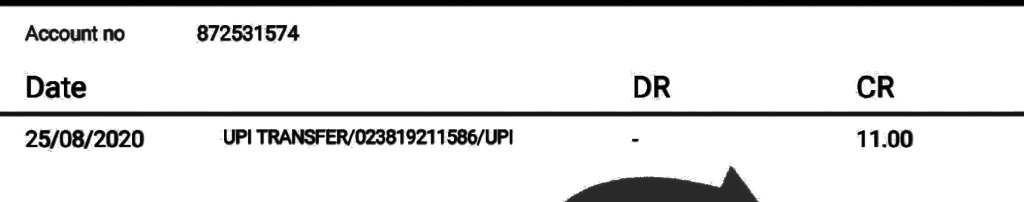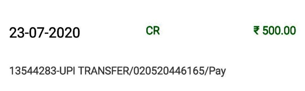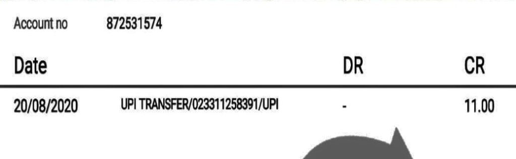 Your a/c. XXXX1574 is credited by Rs. 11.00 on 27-07-20 by a/c linked to mobile 9XXXXXX613 (IMPS Ref no. 020922825052).