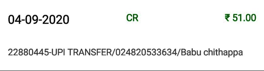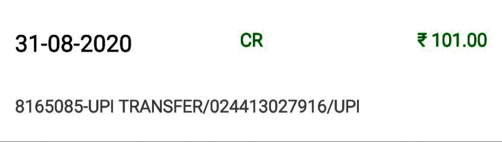 Your a/c. XXXX1574 is credited by Rs. 11.00 on 28-07-20 by a/c linked to mobile 9XXXXXX577 (IMPS Ref no. 021003180380).