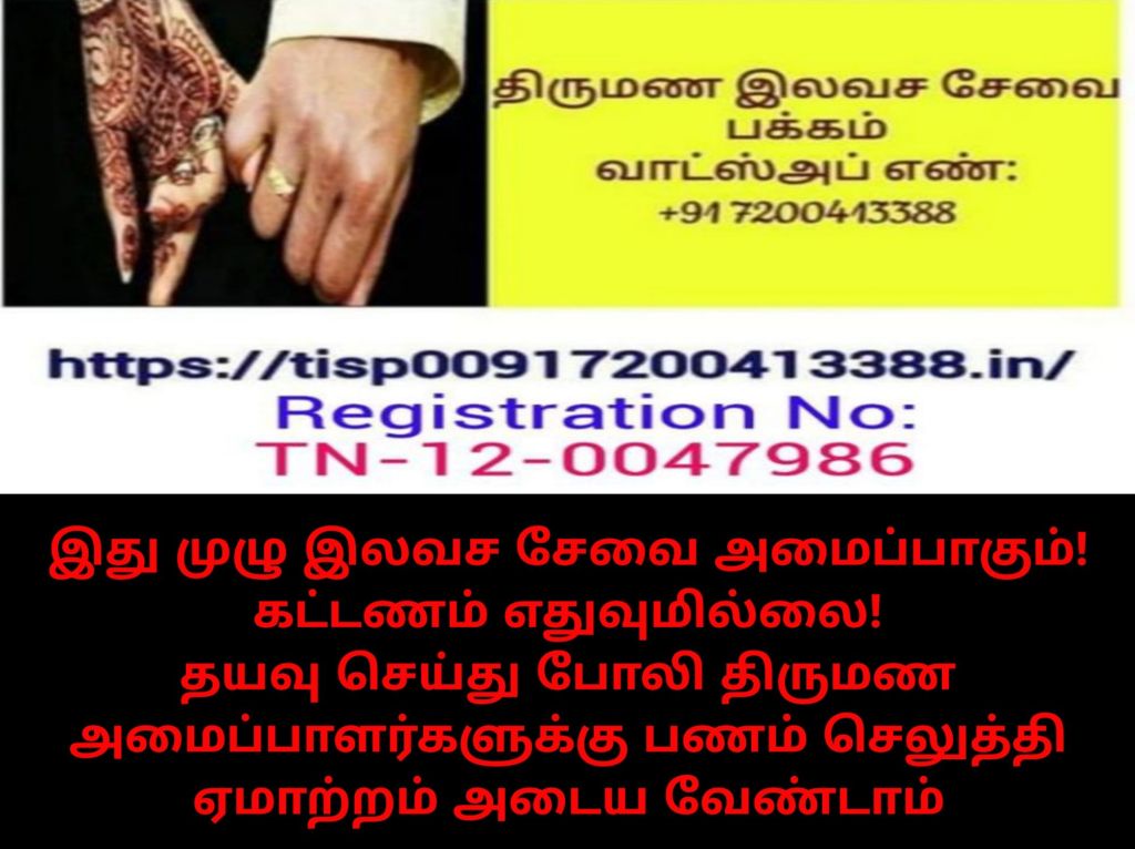 திருமண இலவச சேவை பக்கத்தில் பதிவு செய்துள்ள ஒரு மணமகனுக்கு, திருமண இலவச சேவை பக்கத்தில் பதிவு செய்துள்ள ஒரு மணமகளை பிடித்து இருப்பினும், அந்த மணமகளின் சுயவிவரங்களில், அவர்கள் அளித்துள்ள,மணமகளின் விருப்பத்தை அறிந்து, அவர்களின் விருப்பத் தகுதிக்கு இணையான மணமகனாக இருப்பின், அந்த மணமகளின் சுயவிவரத்தை ஸகிரீன் சாட்(Screenshot ) எடுத்து திருமண இலவச சேவை பக்கத்தின் வாட்ஸ் அப் எண்+91 7200413388 என்ற எண்ணிற்கு மணமகன் எங்களிடம் பதிவு செய்துள்ள வாட்ஸ் அப் எண்ணிலிருந்து அனுப்பி வைக்கவும்!