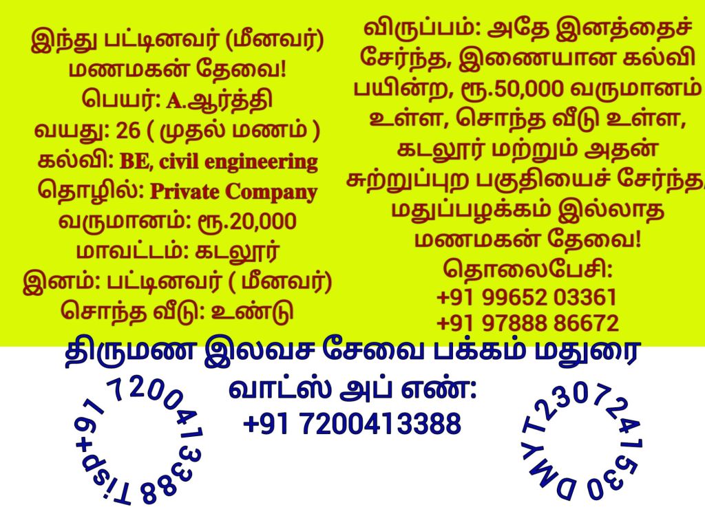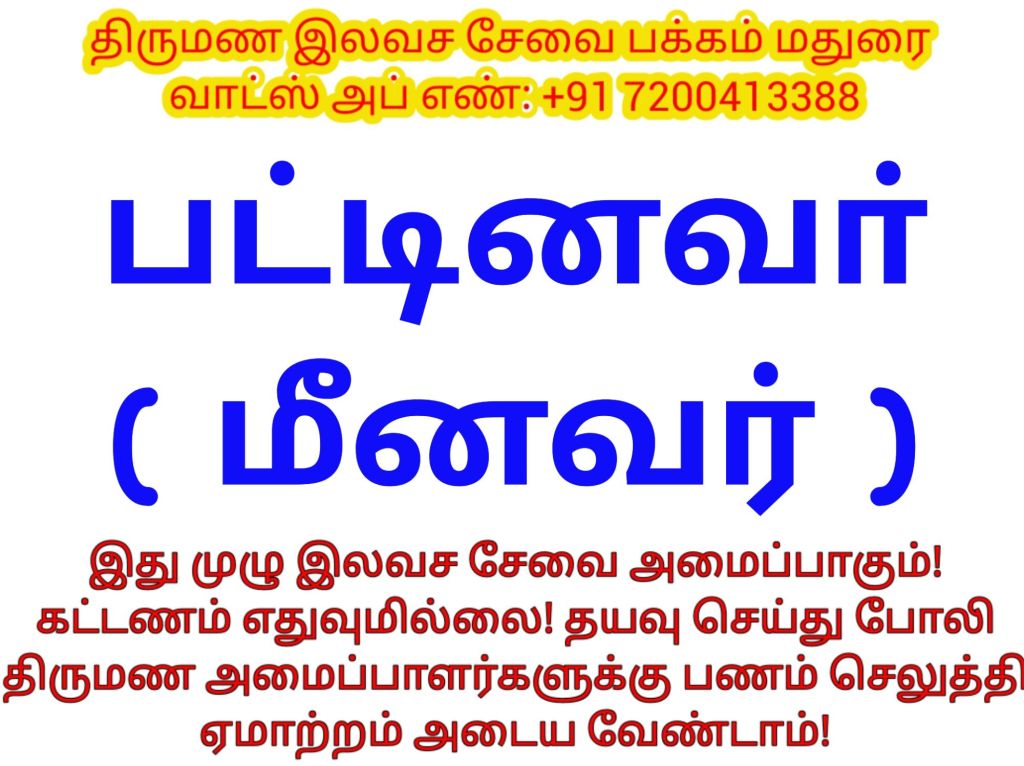 திருமண இலவச சேவை பக்கம், மதுரை, வாட்ஸ் அப் எண்: +91 7200413388 இது முழு இலவச சேவை அமைப்பாகும்! கட்டணம் எதுவுமில்லை!