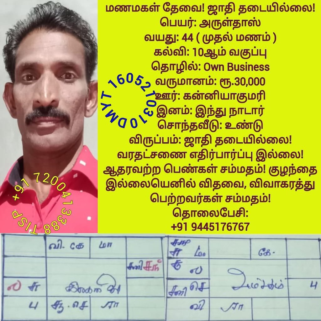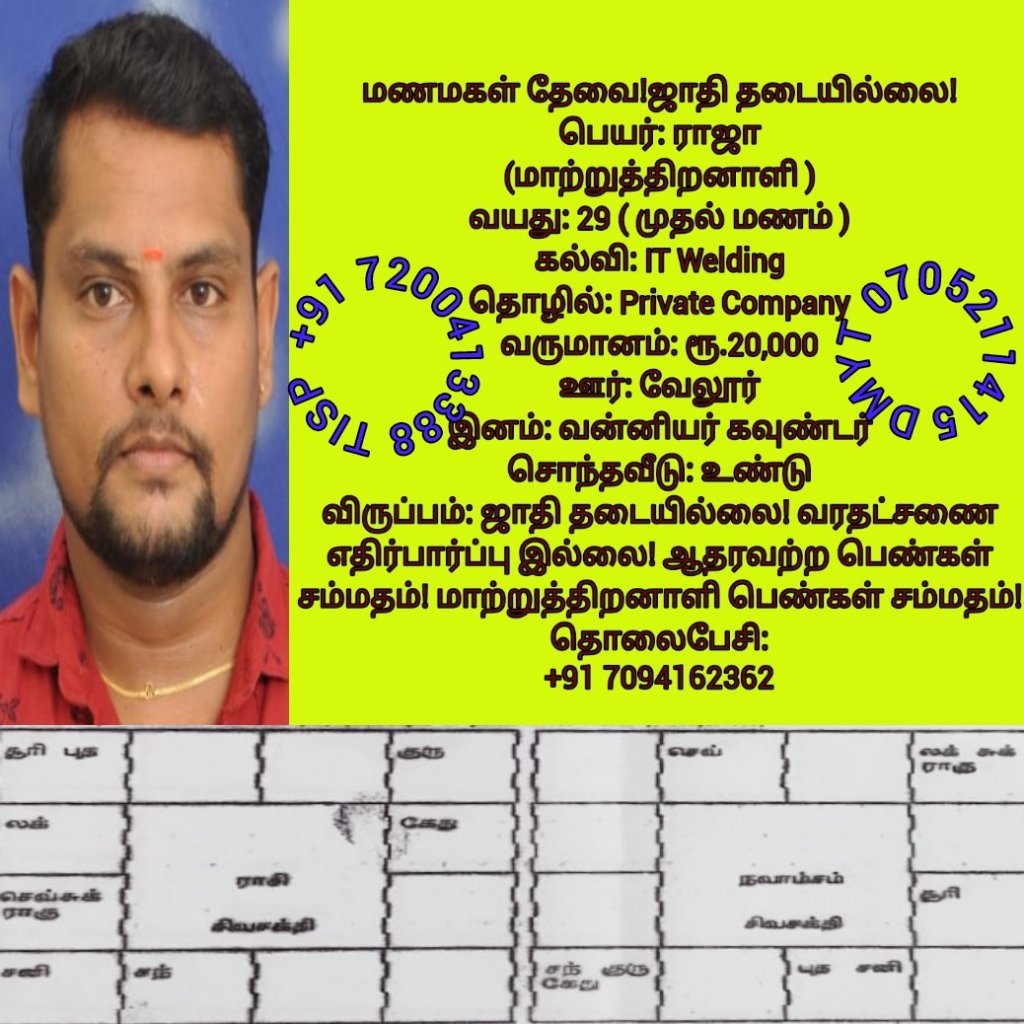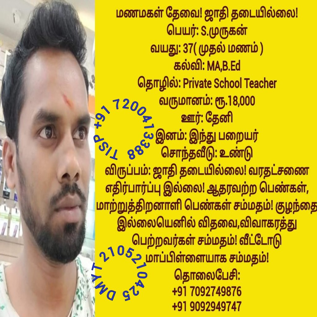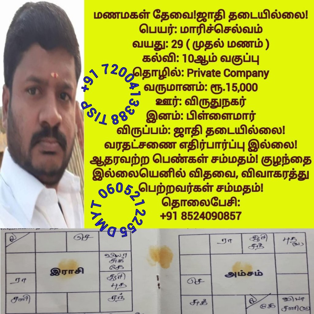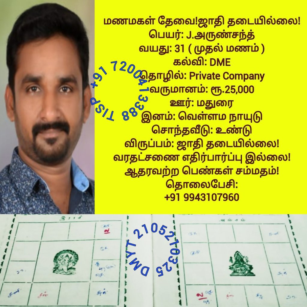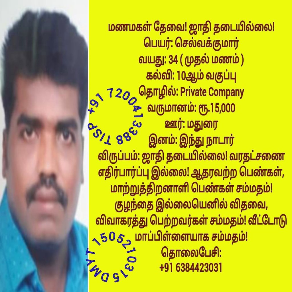 • திருமண இலவச சேவை பக்கம், மதுரை, வாட்ஸ் அப் எண்: +91 7200413388  இது முழு இலவச சேவை அமைப்பாகும்! கட்டணம் எதுவுமில்லை!