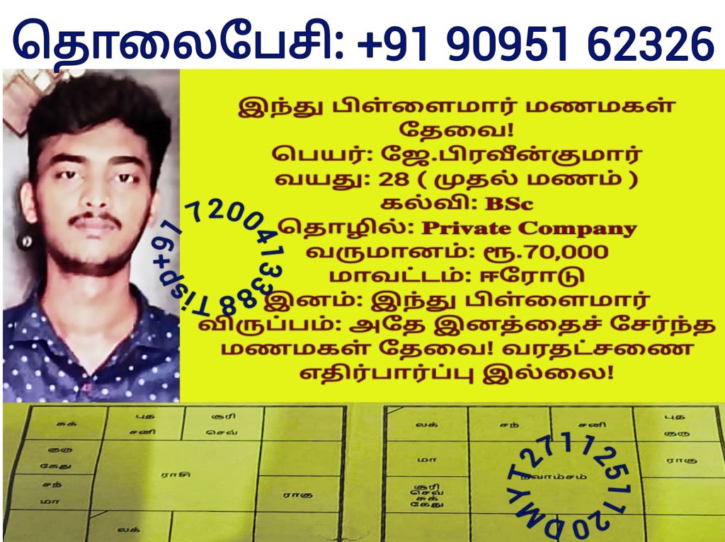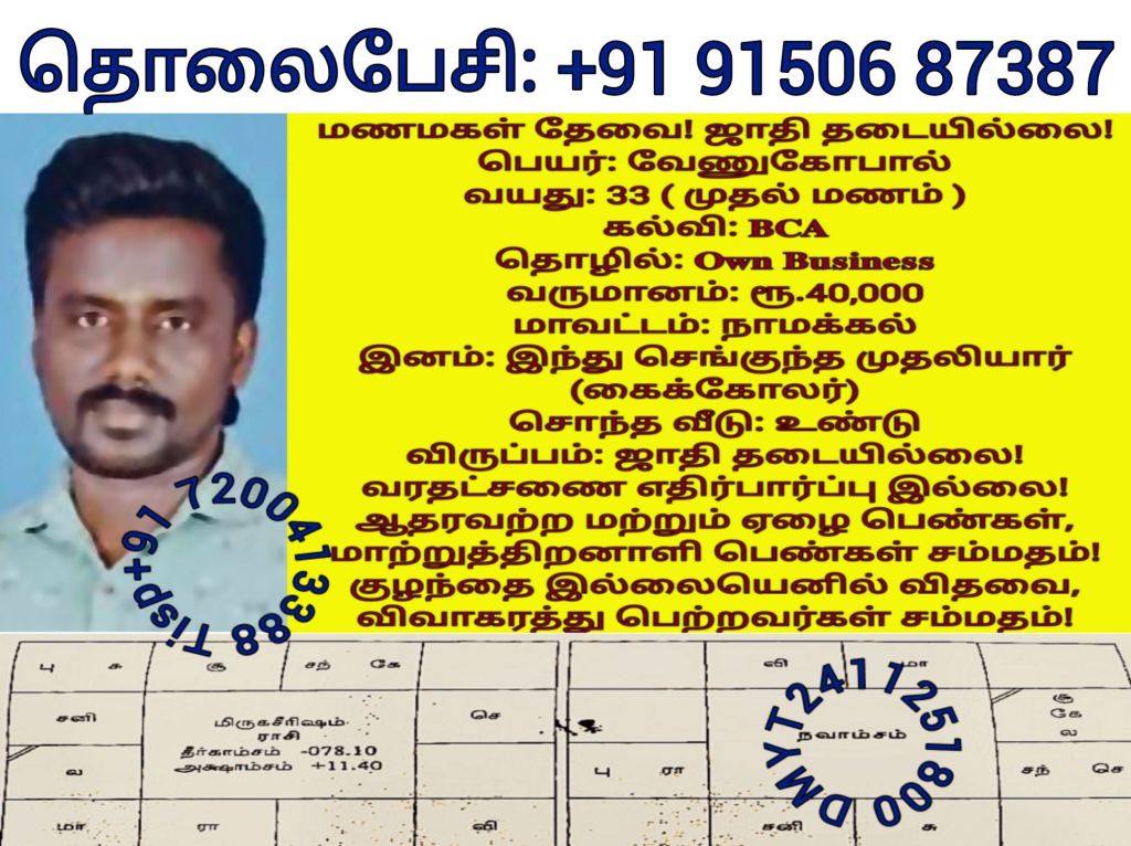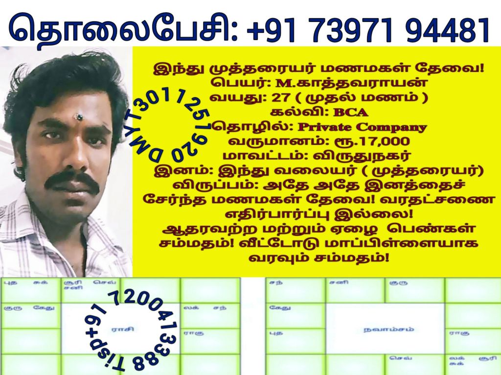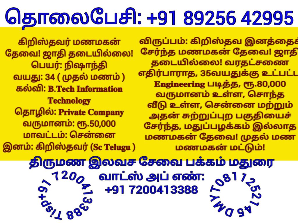 சத்யலெட்சுமி, திருநெல்வேலி தொலைபேசி எண்களை விளம்பரபடுத்த விரும்பவில்லை! மணமகளின் விருப்பத்திற்கு தகுதியான திருமண இலவச சேவை பக்க உறுப்பினர்கள் மட்டும் திருமண இலவச சேவை பக்கத்தை தொடர்பு கொள்ளவும், விருப்பத்திற்கு தகுதியில்லை என்றால் தயவு செய்து எங்களது சேவை நேரத்தை வீணாக்குவதை தவிர்க்கவும், நன்றிDownload