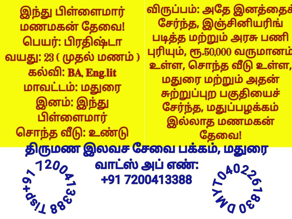 மதுரை மாவட்டத்தைச் சேர்ந்த மணமக்களின் விவரங்கள்! @TispMadurai வாட்ஸ் அப் எண்: +91 7200413388: https://www.youtube.com/playlist?list=PLn95ktZ5NYnmfPXI3TDv8IVNuiPa9Oel-