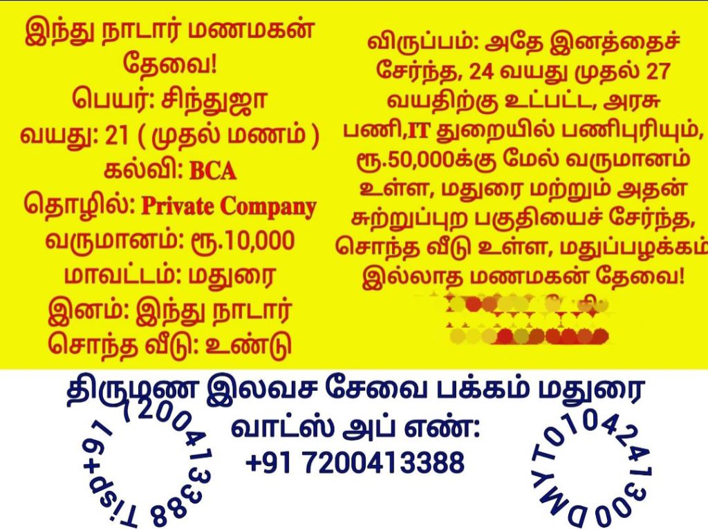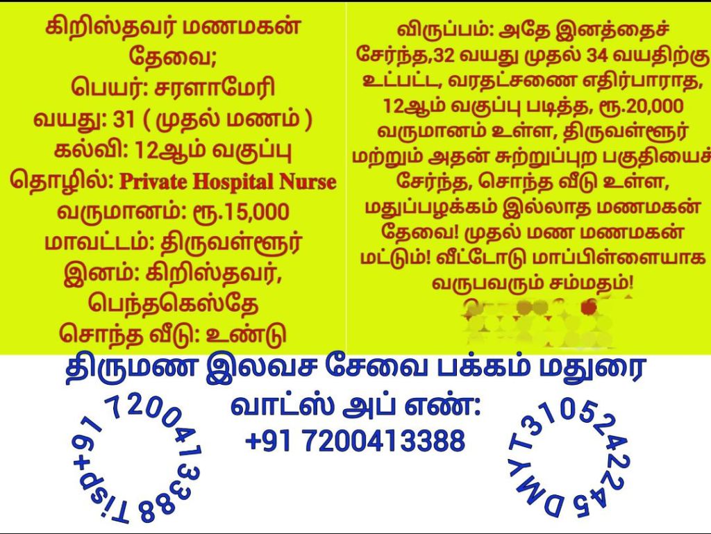 மணமகளின் விருப்பத்திற்கு தகுதியான மணமகன்கள் மட்டும் மணமகளைத் தொடர்பு கொள்ளவும், விருப்பத்திற்கு தகுதியில்லை என்றால் தயவு செய்து தவிர்க்கவும்,கன்னியத்துடன் பேசவும்! நன்றி