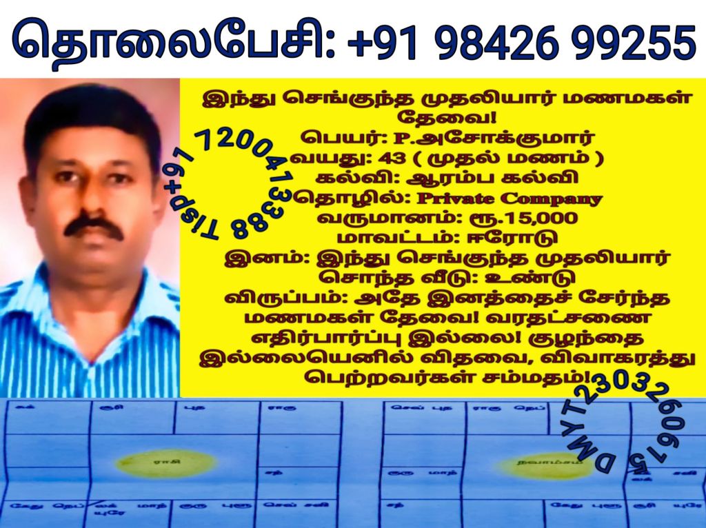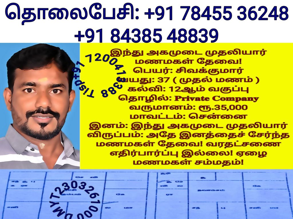 தொலைபேசி எண்களை விளம்பரபடுத்த மணமகள் வீட்டினர் விரும்பவில்லை! மணமகளின் விருப்பத்திற்கு தகுதியான திருமண இலவச சேவை பக்க உறுப்பினர்கள் மட்டும் திருமண இலவச சேவை பக்கத்தை தொடர்பு கொள்ளவும், விருப்பத்திற்கு தகுதியில்லை என்றால் தயவு செய்து எங்களது சேவை நேரத்தை வீணாக்குவதை தவிர்க்கவும், நன்றி