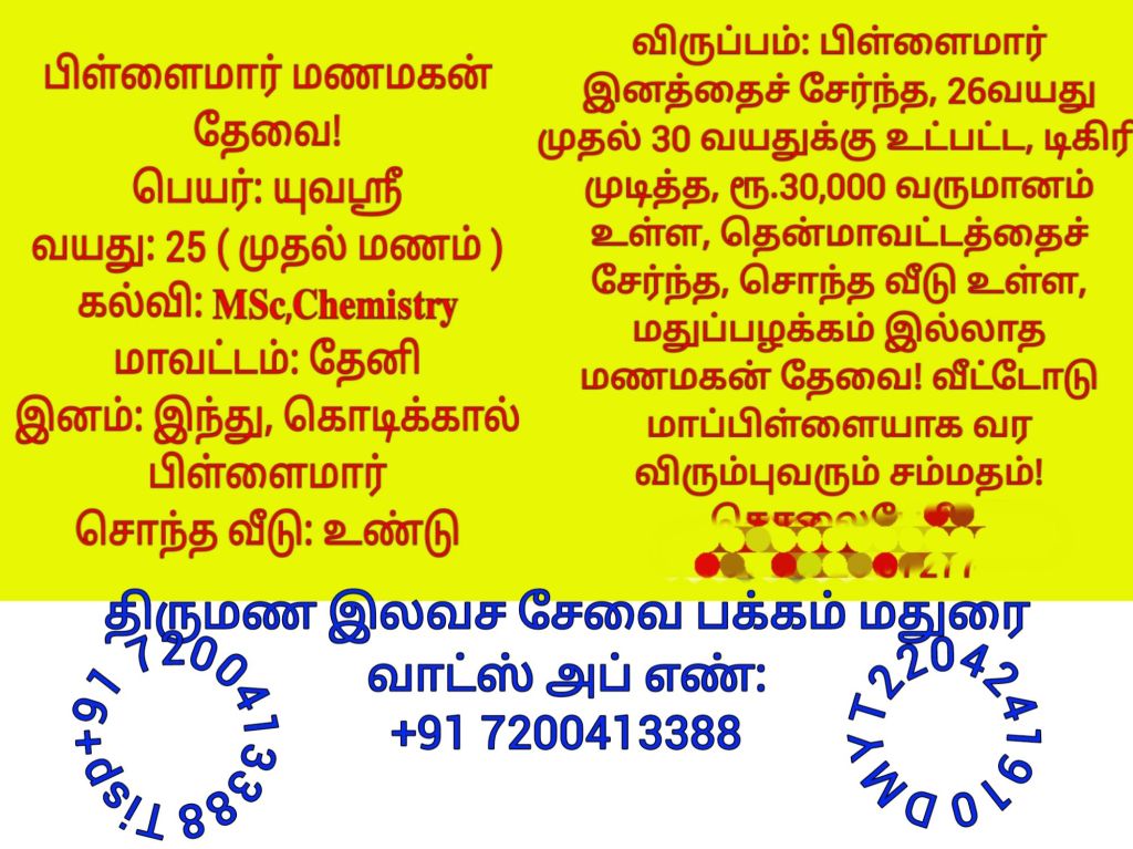 தேனி மாவட்டத்தைச் சேர்ந்த மணமக்களின் விவரங்கள்! @TispMadurai வாட்ஸ் அப் எண்: +91 7200413388: https://www.youtube.com/playlist?list=PLn95ktZ5NYnmnbheJbZPVMb28y_XuNQZA