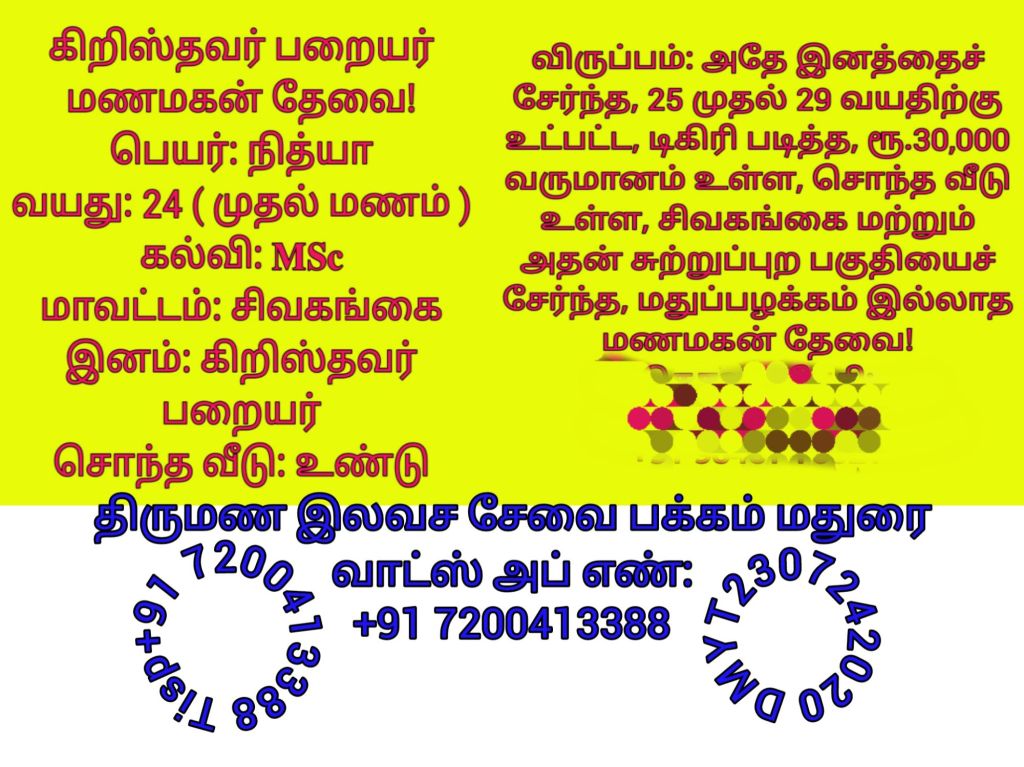 கிறிஸ்தவர் இனத்தைச் சேர்ந்த மணமக்களின் விவரங்கள்! @TispMadurai வாட்ஸ் அப் எண்: +91 7200413388: https://www.youtube.com/playlist?list=PLn95ktZ5NYnnXgqVCmLXj-jVSblrvCFI-