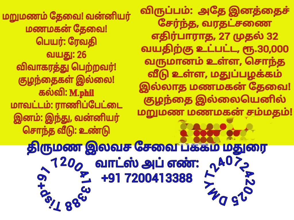 மணமகளின் விருப்பத்திற்கு தகுதியான திருமண இலவச சேவை பக்க உறுப்பினர்கள் மட்டும் திருமண இலவச சேவை பக்கத்தை தொடர்பு கொள்ளவும், விருப்பத்திற்கு தகுதியில்லை என்றால் தயவு செய்து எங்களது சேவை நேரத்தை வீணாக்குவதை தவிர்க்கவும், நன்றி